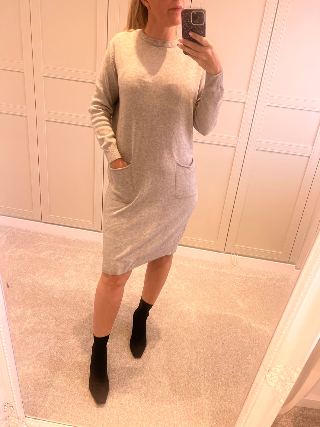 Effortlessly chic and endlessly comfortable, this light grey sweater dress is your go-to piece for cozy sophistication. Crafted from a soft, mid-weight knit, it features a relaxed silhouette with long sleeves, ribbed trims, and two front patch pockets for a touch of casual charm. The knee-length cut makes it perfect for layering with tights and boots on cooler days or pairing with ankle boots for a sleek, modern look.