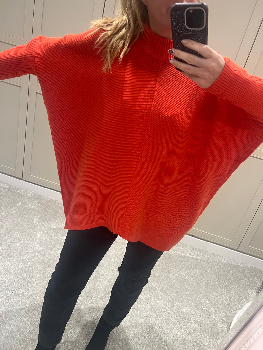 Brighten up your knitwear collection with this statement oversized jumper. Designed in a bold orange hue, this soft ribbed knit features a flattering high neckline, relaxed dropped shoulders and long sleeves for an effortlessly cosy look. The longer length and loose fit make it perfect for layering over leggings or jeans, offering comfort and style in equal measure.
