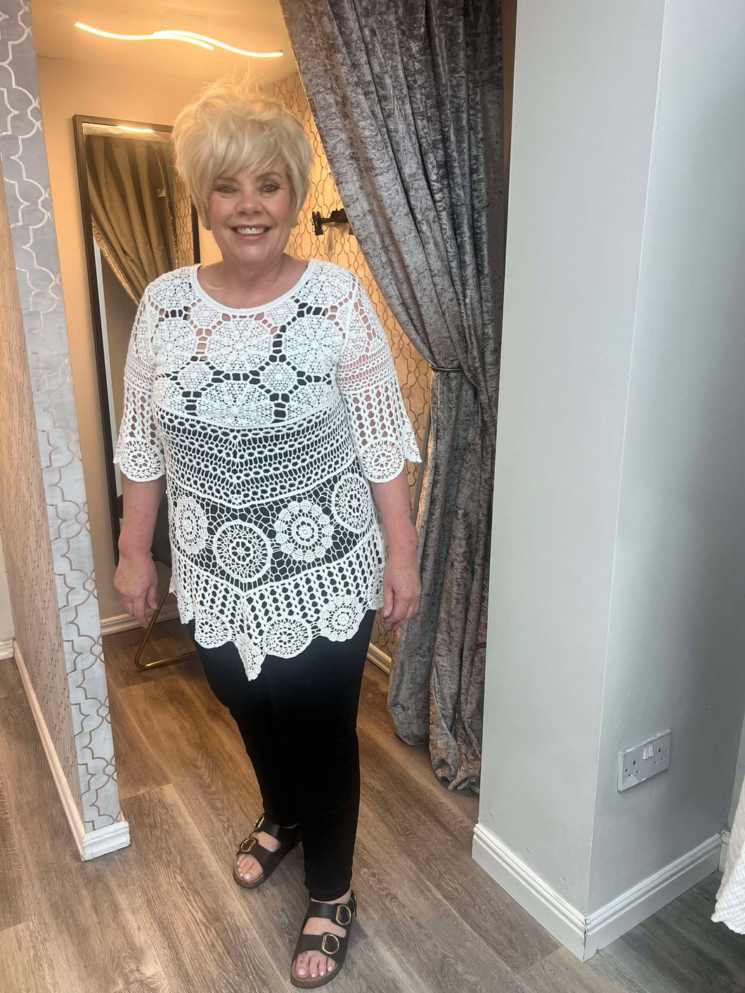 Float through sunny days in this airy white tunic, hand‑crocheted from soft cotton for a feather‑light feel. Intricate mandala‑inspired motifs create a semi‑sheer patchwork that lets your swimwear or a nude cami peek through, while the scalloped hem and fluted three‑quarter sleeves add romantic movement with every step. Cut to drape loosely past the hips, it balances perfectly over slim denim, tailored shorts or wide‑leg trousers for effortless beach‑to‑brunch style. Slip it on and let the artisanal texture do all the talking.