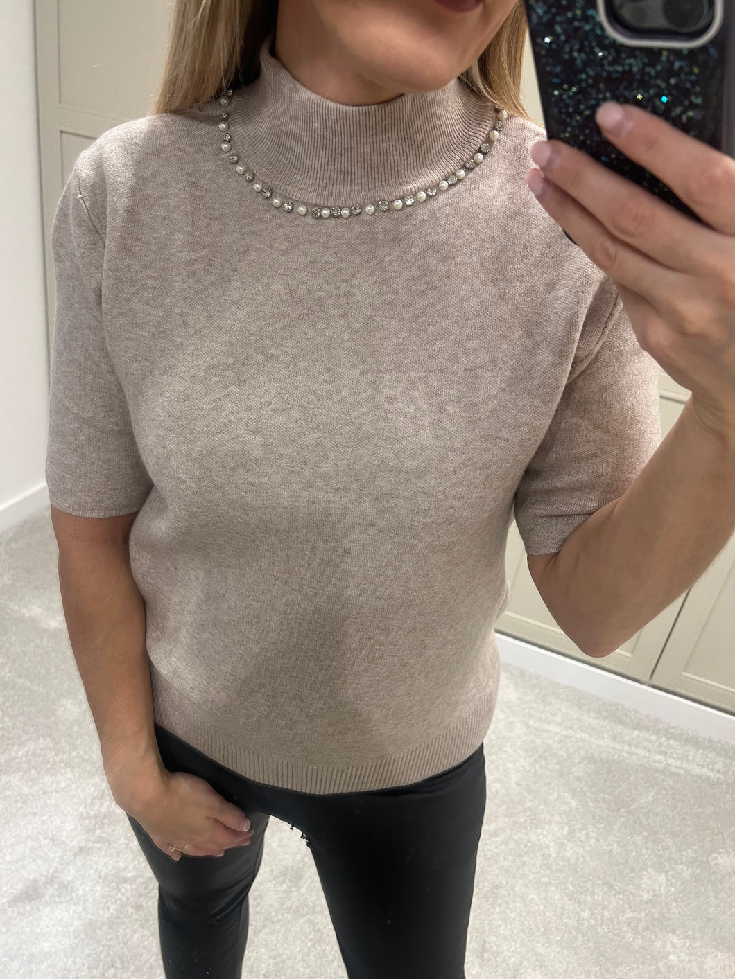Elevate your everyday style with this chic short-sleeve knit top, featuring a soft beige hue and a flattering mock neck. The neckline is delicately adorned with a row of sparkling crystal embellishments, adding a touch of understated glamour. Crafted from a fine, lightweight knit, this top offers a comfortable fit and a smooth, elegant finish. Perfect for pairing with jeans or tailored trousers for a refined yet effortless look.